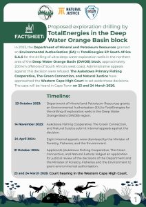 In 2023, the Department of Mineral and Petroleum Resources granted an Environmental Authorisation (EA) to TotalEnergies EP South Africa S.A.S for the drilling of ultra deep water exploration wells in the northern area of the Deep Water Orange Basin (DWOB) block, approximately 200 km offshore of South Africa’s west coast. Administrative appeals against this decision were refused. The Aukotowa Primary Fishing Cooperative, The Green Connection, and Natural Justice have approached the Western Cape High Court to set aside these decisions.